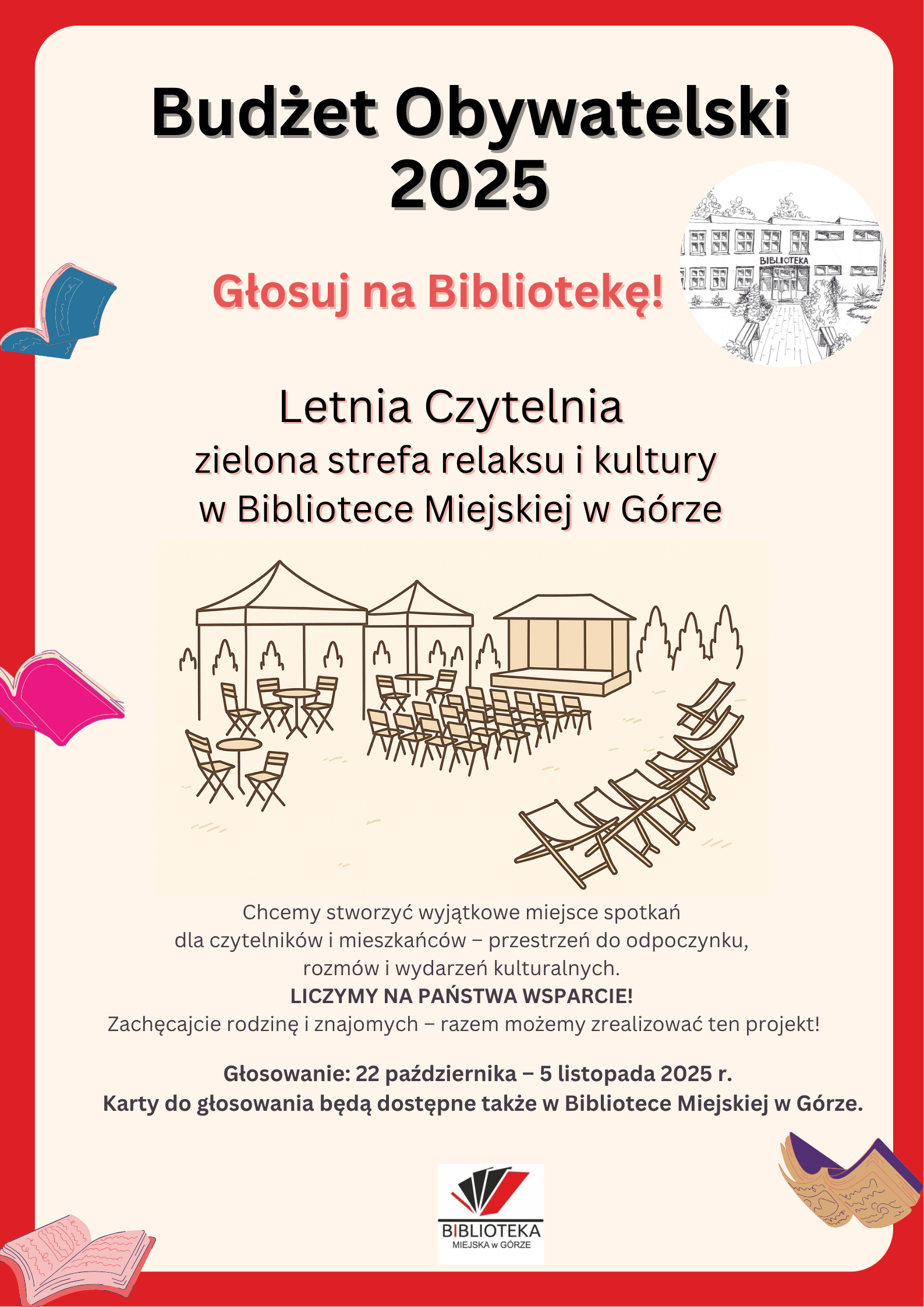 Chcemy stworzyć Letnią Czytelnię - zieloną strefę relaksu i kultury przy Bibliotece Miejskiej w Górze. To będzie miejsce spotkań dla czytelników i mieszkańców - przestrzeń do odpoczynku, rozmów i wydarzeń kulturalnych.