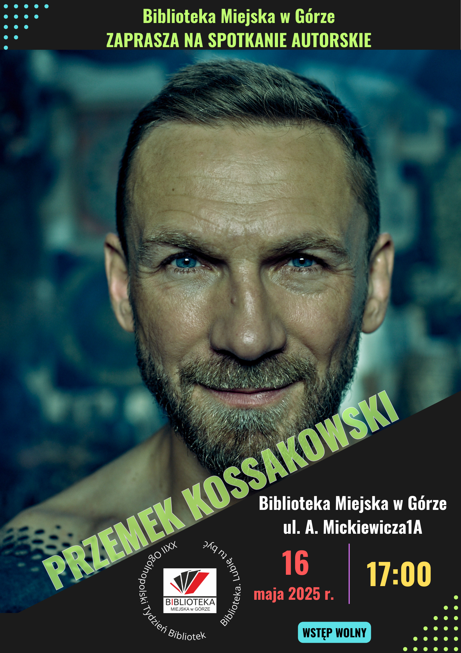 Zapraszamy na spotkanie z Przemkiem Kossakowskim, które odbędzie się 16 maja 2025 r. (piątek) o godzinie 17:00 w Bibliotece Miejskiej w Górze.